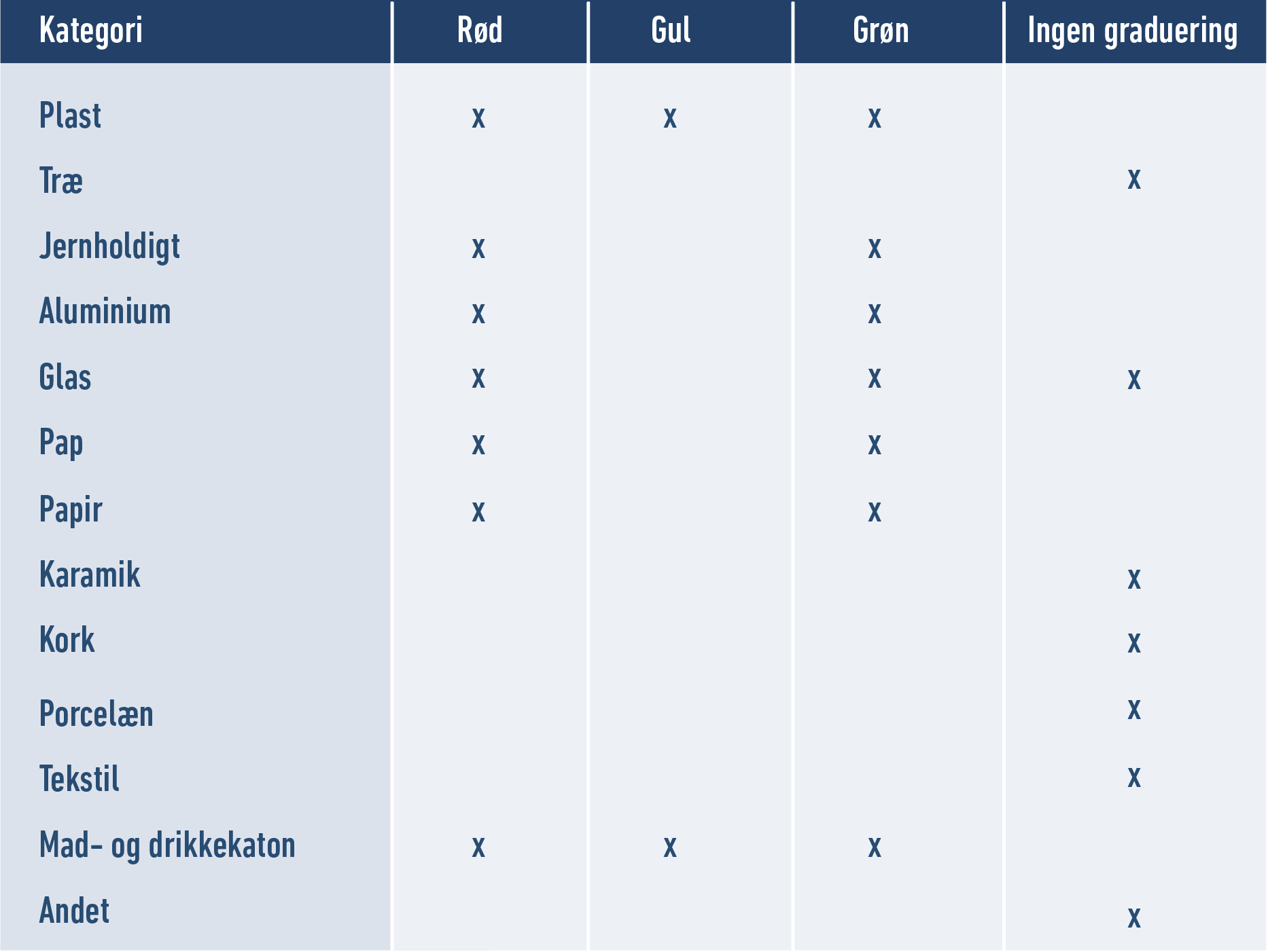 - For virksomheder, hvis emballagemængde overstiger 8 tons årligt, skal der for enkelte typer af emballage ske en miljøgraduering (rød, gul og grøn) i forhold til genanvendeligheden af produktet, mens andre typer af emballage ikke skal miljøgradueres.
